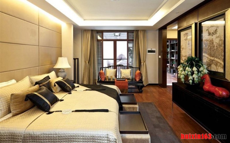 卧室使用单纯的线条,简单的建筑细节,利用软装饰和艺术品点缀空间,使空间显得和谐,淡雅,让我们从中领略古典家居风韵的同时,也有对未来生活的追求。空间不同于传统古典家居的“精雕细琢”,取而代之的是简洁与明快的步调,营造出极富中国特色的大方稳重的生活空间。