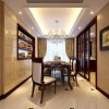 本套餐厅装饰的整体效果可以带给人们一种大气感,空间内的整体色调比较柔和,一款黑色铁艺吊灯悬挂在平顶式设计的石膏板吊顶上,可以更加彰显别致的设计,同时也凸显出了空间装饰的亮点。