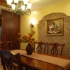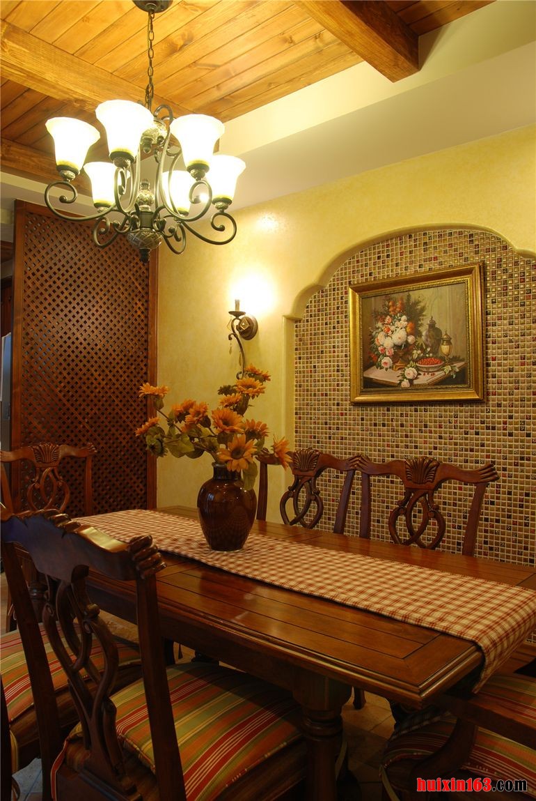 本套餐厅装饰中由于空间内大量的使用了木材做装造型,所以可以使整个空间都衬托的十分具有古典气息,空间内的吊顶使用了装饰木板做设计,可以将中间的黑色铁艺吊灯衬托的更加具有设计感。