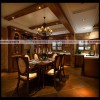 本套餐厅装饰中由于空间内大量的使用了木材做装造型,所以可以使整个空间都衬托的十分具有古典气息,空间内的吊顶使用了装饰木板做设计,可以将中间的黑色铁艺吊灯衬托的更加具有设计感。