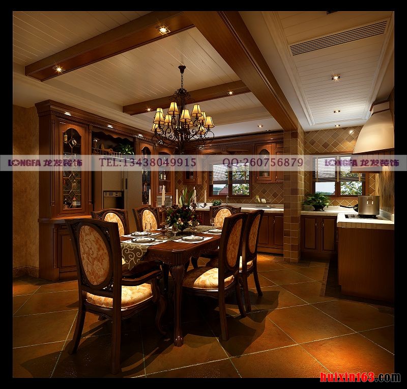 本套餐厅装饰中由于空间内大量的使用了木材做装造型,所以可以使整个空间都衬托的十分具有古典气息,空间内的吊顶使用了装饰木板做设计,可以将中间的黑色铁艺吊灯衬托的更加具有设计感。