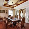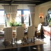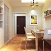 本套餐厅装饰中空间内的装饰色调比较偏暗,石膏板吊顶上的设计比较富有个性,也将中间的铁艺吊灯衬托的更加具有美感,下方的实木餐桌搭配上同一系列的桌椅使空间装饰显得更加协调,并附有一定的神秘气息。