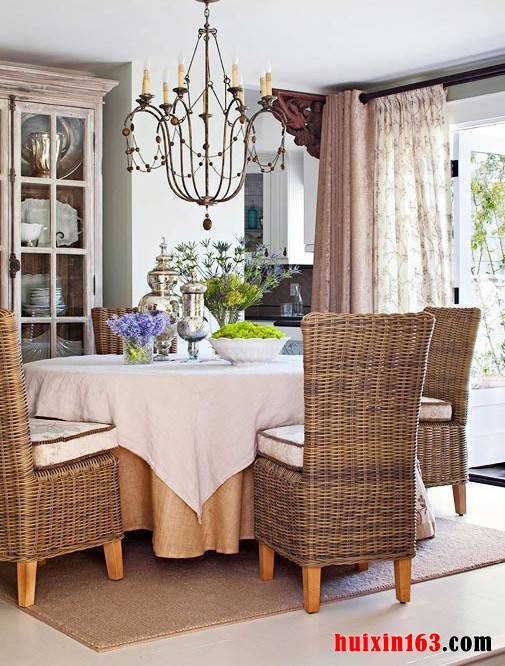 本套餐厅装饰中空间内的装饰色调比较偏暗,石膏板吊顶上的设计比较富有个性,也将中间的铁艺吊灯衬托的更加具有美感,下方的实木餐桌搭配上同一系列的桌椅使空间装饰显得更加协调,并附有一定的神秘气息。