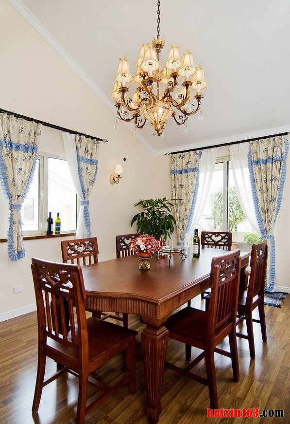 本套餐厅装饰中空间内的装饰色调比较偏暗,石膏板吊顶上的设计比较富有个性,也将中间的铁艺吊灯衬托的更加具有美感,下方的实木餐桌搭配上同一系列的桌椅使空间装饰显得更加协调,并附有一定的神秘气息。