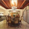 本套餐厅装饰中空间内的装饰色调比较偏暗,石膏板吊顶上的设计比较富有个性,也将中间的铁艺吊灯衬托的更加具有美感,下方的实木餐桌搭配上同一系列的桌椅使空间装饰显得更加协调,并附有一定的神秘气息。