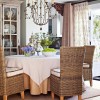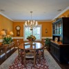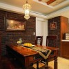 本套餐厅装饰中空间内的装饰色调比较偏暗,石膏板吊顶上的设计比较富有个性,也将中间的铁艺吊灯衬托的更加具有美感,下方的实木餐桌搭配上同一系列的桌椅使空间装饰显得更加协调,并附有一定的神秘气息。