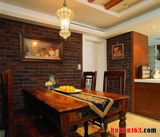 本套餐厅装饰中空间内的装饰色调比较偏暗,石膏板吊顶上的设计比较富有个性,也将中间的铁艺吊灯衬托的更加具有美感,下方的实木餐桌搭配上同一系列的桌椅使空间装饰显得更加协调,并附有一定的神秘气息。