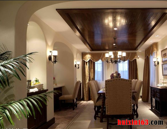 本套餐厅装饰比较大气,空间内的色调搭配比较协调,木质吊顶更是可以彰显美式风格的古典气息,中间一款水晶吊灯可以将空间的整体亮点都集结与一身,比较附有美感。
