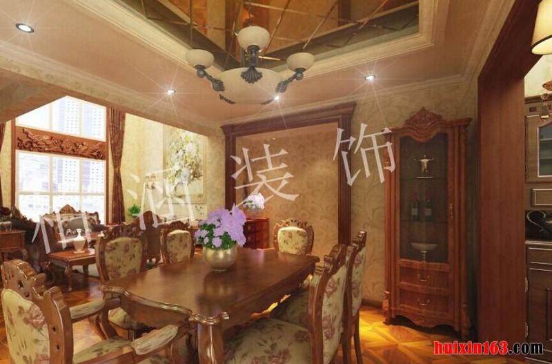 本套餐厅装饰比较大气,空间内的色调搭配比较协调,木质吊顶更是可以彰显美式风格的古典气息,中间一款水晶吊灯可以将空间的整体亮点都集结与一身,比较附有美感。