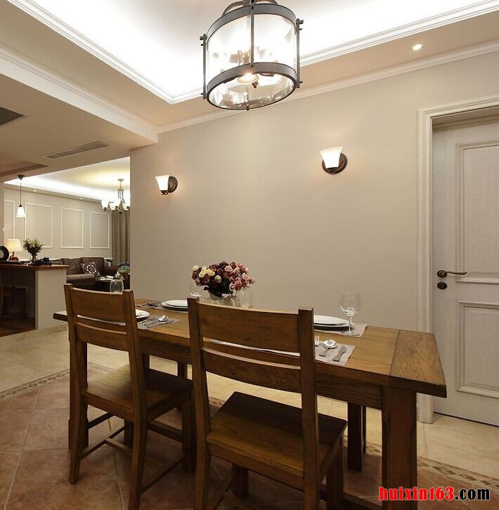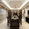 本套餐厅装饰比较大气,空间内的色调搭配比较协调,木质吊顶更是可以彰显美式风格的古典气息,中间一款水晶吊灯可以将空间的整体亮点都集结与一身,比较附有美感。
