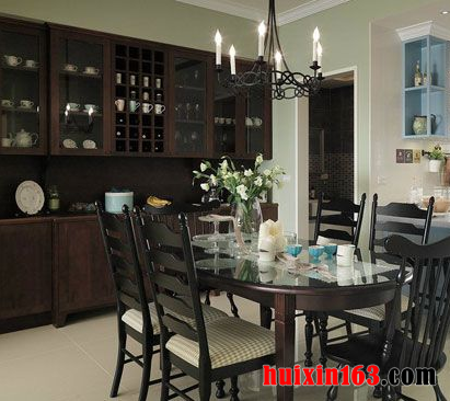 本套餐厅装饰比较大气,空间内的色调搭配比较协调,木质吊顶更是可以彰显美式风格的古典气息,中间一款水晶吊灯可以将空间的整体亮点都集结与一身,比较附有美感。