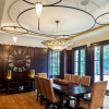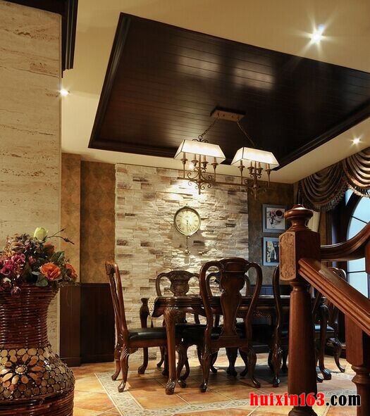 本套餐厅装饰比较大气,空间内的色调搭配比较协调,木质吊顶更是可以彰显美式风格的古典气息,中间一款水晶吊灯可以将空间的整体亮点都集结与一身,比较附有美感。