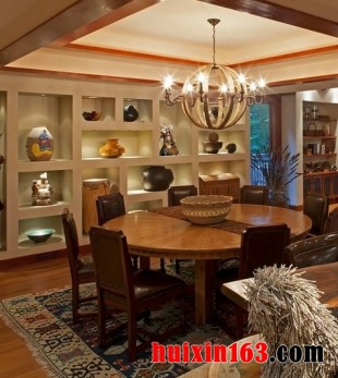 本套餐厅装饰比较大气,空间内的色调搭配比较协调,木质吊顶更是可以彰显美式风格的古典气息,中间一款水晶吊灯可以将空间的整体亮点都集结与一身,比较附有美感。