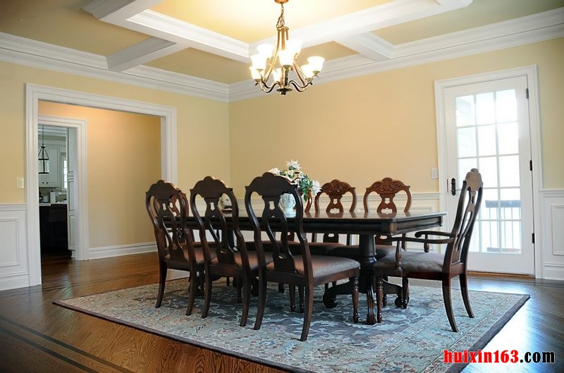 本套餐厅装饰比较大气,空间内的色调搭配比较协调,木质吊顶更是可以彰显美式风格的古典气息,中间一款水晶吊灯可以将空间的整体亮点都集结与一身,比较附有美感。