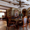 本套餐厅装饰比较大气,空间内的色调搭配比较协调,木质吊顶更是可以彰显美式风格的古典气息,中间一款水晶吊灯可以将空间的整体亮点都集结与一身,比较附有美感。