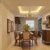 本套餐厅装饰的整体效果可以带给人们一种大气感,空间内的石膏板采用了凹槽的设计,并在中间悬挂了一种铁艺吊灯,在彰显独特设计的同时,也可以使空间显得更加通透,更加明亮。