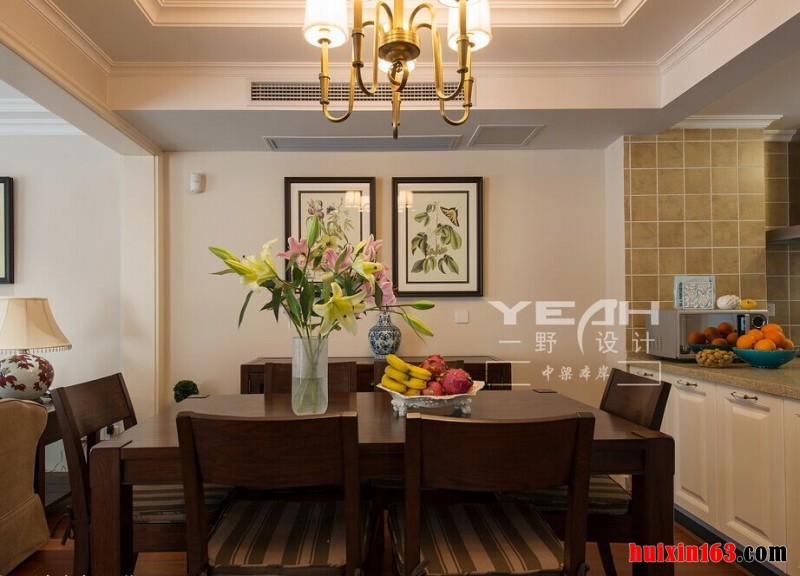 本套餐厅装饰中石膏板吊顶的设计比较别致,搭配上装饰木方做造型更是可以凸显出一种美感,吊顶上的铁艺水晶吊灯更是别致,可以将唯美与时尚彰显的淋漓尽致,从中也可以看出美式风格的装饰特点。