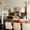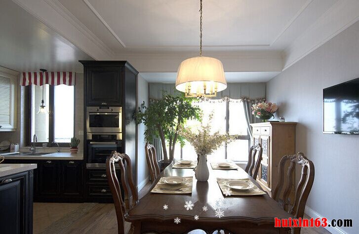 本套餐厅装饰中石膏板吊顶的设计比较别致,搭配上装饰木方做造型更是可以凸显出一种美感,吊顶上的铁艺水晶吊灯更是别致,可以将唯美与时尚彰显的淋漓尽致,从中也可以看出美式风格的装饰特点。