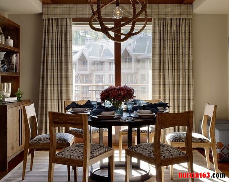 本套餐厅装饰中石膏板吊顶的设计比较别致,搭配上装饰木方做造型更是可以凸显出一种美感,吊顶上的铁艺水晶吊灯更是别致,可以将唯美与时尚彰显的淋漓尽致,从中也可以看出美式风格的装饰特点。