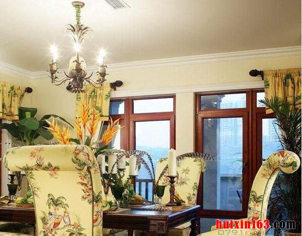 本套餐厅装饰中石膏板吊顶的设计比较别致,搭配上装饰木方做造型更是可以凸显出一种美感,吊顶上的铁艺水晶吊灯更是别致,可以将唯美与时尚彰显的淋漓尽致,从中也可以看出美式风格的装饰特点。