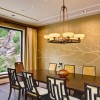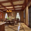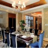 本套餐厅装饰中石膏板吊顶的设计比较别致,搭配上装饰木方做造型更是可以凸显出一种美感,吊顶上的铁艺水晶吊灯更是别致,可以将唯美与时尚彰显的淋漓尽致,从中也可以看出美式风格的装饰特点。