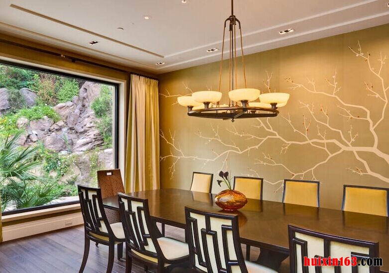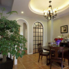 本套餐厅装饰中石膏板吊顶的设计比较别致,搭配上装饰木方做造型更是可以凸显出一种美感,吊顶上的铁艺水晶吊灯更是别致,可以将唯美与时尚彰显的淋漓尽致,从中也可以看出美式风格的装饰特点。
