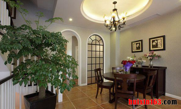 本套餐厅装饰中石膏板吊顶的设计比较别致,搭配上装饰木方做造型更是可以凸显出一种美感,吊顶上的铁艺水晶吊灯更是别致,可以将唯美与时尚彰显的淋漓尽致,从中也可以看出美式风格的装饰特点。