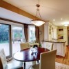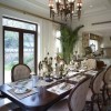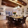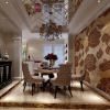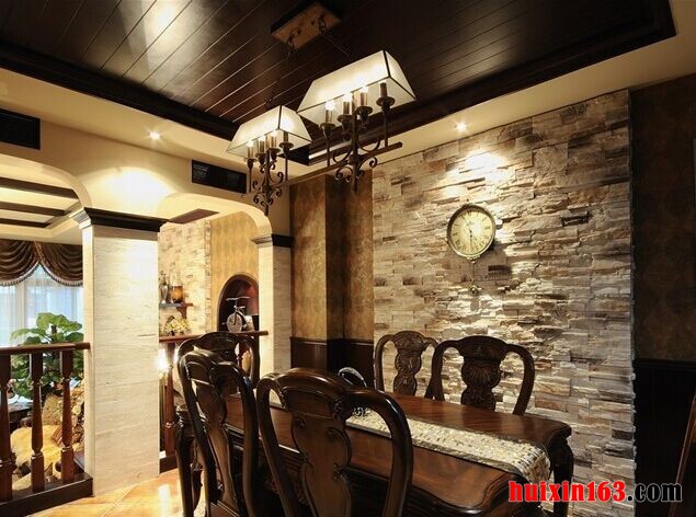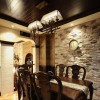 本套餐厅装饰中吊顶的设计比较具有个性,黑胡桃色的装饰面板做吊顶,在搭配上一款十分具有个性的铁艺吊灯,更是可以为空间增添一丝神秘感,墙壁上的仿古砖设计的也恰到好处,可以将美式风格的古典美彰显出来。