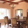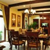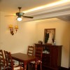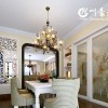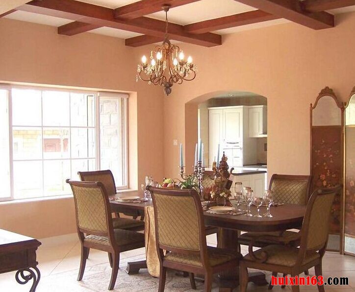 本套餐厅装饰中空间内的色彩搭配比较柔和,并没有艳丽的色彩却也并不缺乏个性,空间内的吊顶采用了装饰木方做造型,可以将中间的铁艺水晶吊灯衬托的更加精美,也为空间装饰增添了亮点。