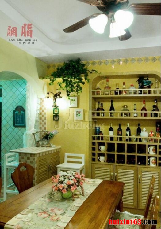 本套餐厅装饰中空间内的色彩搭配比较柔和,并没有艳丽的色彩却也并不缺乏个性,空间内的吊顶采用了装饰木方做造型,可以将中间的铁艺水晶吊灯衬托的更加精美,也为空间装饰增添了亮点。