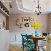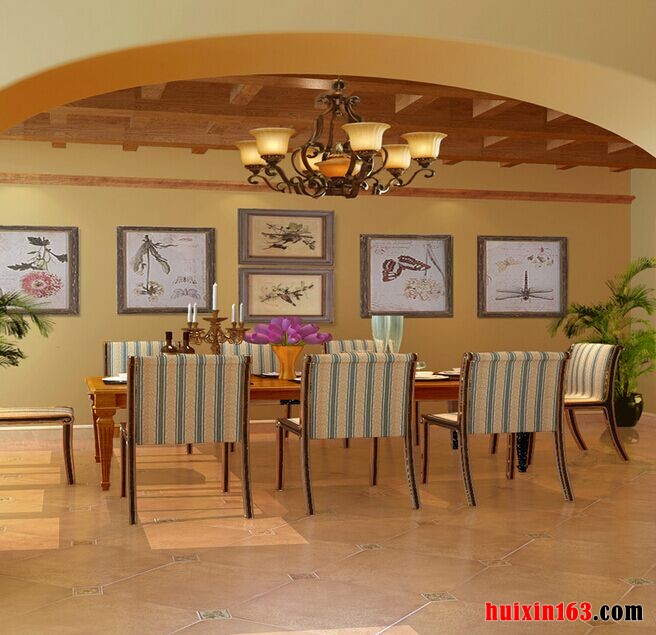 本套餐厅装饰中空间内的色彩搭配比较柔和,并没有艳丽的色彩却也并不缺乏个性,空间内的吊顶采用了装饰木方做造型,可以将中间的铁艺水晶吊灯衬托的更加精美,也为空间装饰增添了亮点。