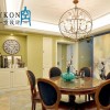 本套餐厅装饰中空间内的色彩搭配比较柔和,并没有艳丽的色彩却也并不缺乏个性,空间内的吊顶采用了装饰木方做造型,可以将中间的铁艺水晶吊灯衬托的更加精美,也为空间装饰增添了亮点。