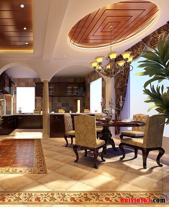 本套餐厅装饰中空间内的色彩搭配比较柔和,并没有艳丽的色彩却也并不缺乏个性,空间内的吊顶采用了装饰木方做造型,可以将中间的铁艺水晶吊灯衬托的更加精美,也为空间装饰增添了亮点。