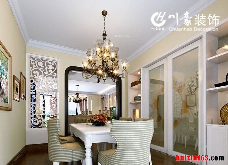 沉静不张扬是美式风格的一大特点,美式风格的装饰虽没有欧式风格那样华美、靓丽,但它的装饰效果也是可以带给人们新奇感的,空间内的装饰中也会透露出一种文艺气息,在原本淡雅的空间内多一丝亮点。 本套餐厅装饰中空间内的色彩搭配比较柔和,并没有艳丽的色彩却也并不缺乏个性,空间内的吊顶采用了装饰木方做造型,可以将中间的铁艺水晶吊灯衬托的更加精美,也为空间装饰增添了亮点。 更多»推荐家装效果图