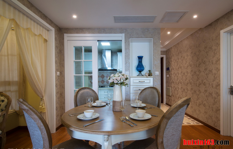 本套餐厅装饰中空间内的色彩搭配比较柔和,并没有艳丽的色彩却也并不缺乏个性,空间内的吊顶采用了装饰木方做造型,可以将中间的铁艺水晶吊灯衬托的更加精美,也为空间装饰增添了亮点。