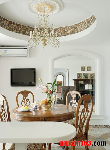 本套餐厅装饰中色彩搭配比较淡雅,平顶式的石膏板也可以显得十分简洁,平顶式的设计也可以凸显出一种大气感,为空间装饰增添两地那,中间的吊灯造型十分别致,也是空间装饰的一大亮点。