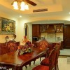 本套餐厅装饰中色彩搭配比较淡雅,平顶式的石膏板也可以显得十分简洁,平顶式的设计也可以凸显出一种大气感,为空间装饰增添两地那,中间的吊灯造型十分别致,也是空间装饰的一大亮点。