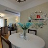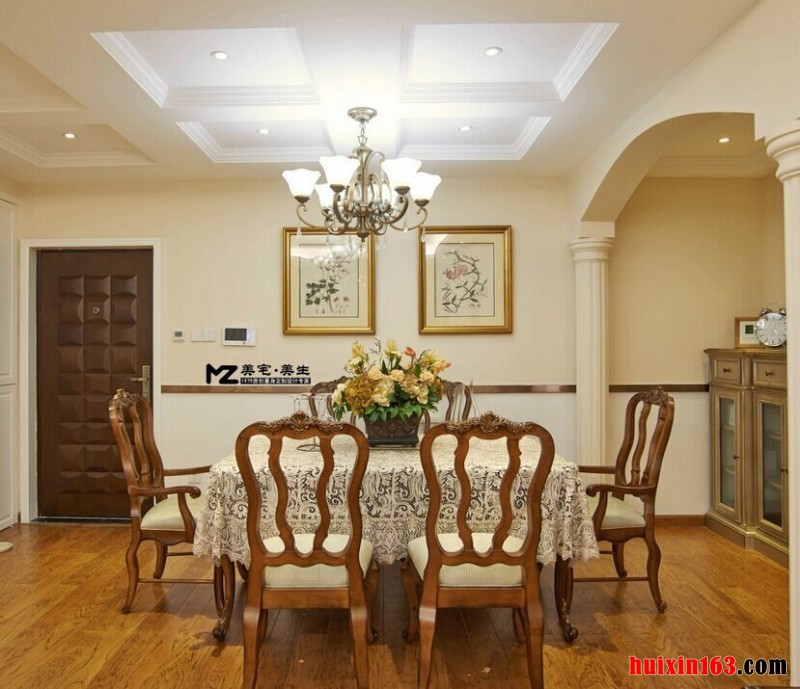 本套餐厅装饰中色彩搭配比较淡雅,平顶式的石膏板也可以显得十分简洁,平顶式的设计也可以凸显出一种大气感,为空间装饰增添两地那,中间的吊灯造型十分别致,也是空间装饰的一大亮点。