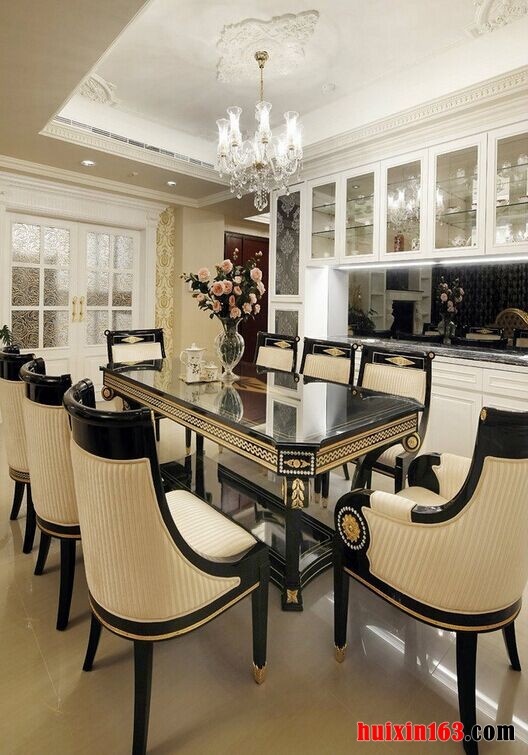 本套餐厅装饰中整体的装饰效果可以带给人们一种大气感,空间内的装饰色调主要是以白色为主,再搭配上中间一款铁艺吊灯可以使整个空间都显得十分唯美,同时也凸显出了一种设计感。