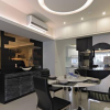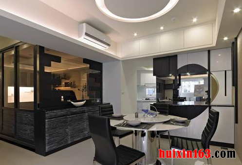 本套餐厅装饰中空间内的装饰色调主要是以黑白灰经典色系为主,这样的装饰并不会带给人们一种厌倦感,反而是凸显出了一种时尚装饰特点,石膏板的设计比较大气,中间的圆形设计也十分具有个性,比较符合本套餐厅装饰的主题。