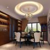 本套餐厅装饰中空间内的装饰色调主要是以黑白灰经典色系为主,这样的装饰并不会带给人们一种厌倦感,反而是凸显出了一种时尚装饰特点,石膏板的设计比较大气,中间的圆形设计也十分具有个性,比较符合本套餐厅装饰的主题。