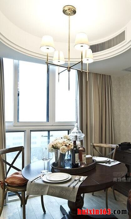 本套餐厅内的石膏板吊顶设计比价具有个性,圆形的设计虽然比较常见,但也并不缺乏设计感,凹槽的设计中搭配了一款造型十分简洁的金属吊灯,使整个空间都显得十分具有时尚气息。