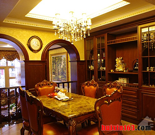 美式风格的设计中经常会出现一些精致的仿古艺术品,这样的设计不仅可以适当的装饰空间,他更可以像来者展现房屋主人的品味与爱好,在古典的装饰环境中添加一些时尚元素,也是装饰的一大亮点。 本套餐厅内的石膏板吊顶设计比价具有个性,圆形的设计虽然比较常见,但也并不缺乏设计感,凹槽的设计中搭配了一款造型十分简洁的金属吊灯,使整个空间都显得十分具有时尚气息。 更多»推荐家装效果图