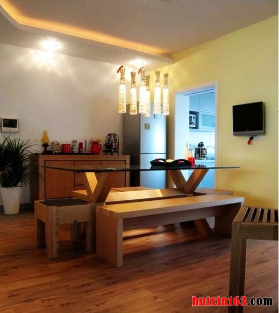 本套餐厅装饰中空间内的装饰色调主要是以白色为主,空间内的石膏板吊顶设计比较具有个性,在搭配上一款银灰色的金属吊灯,更是可以凸显出无限的设计感,与美式风格的独特魅力。