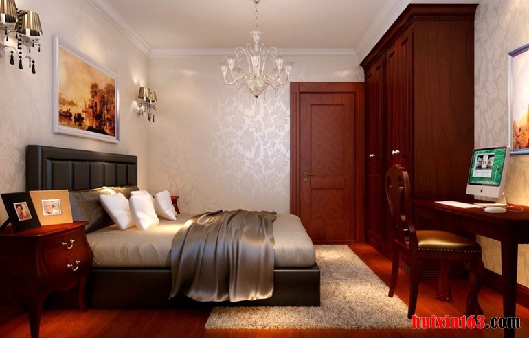 卧室整体装修风格以新古典的华丽优雅融合现代简约的时尚特性,让人感觉眼前一亮。以深色为作为空间的主体色调,再在空间中画龙点睛的缀入鲜亮色彩,优雅经典中也尽显时尚风采。新古典风格的融合,更显现出时尚优雅的风采。美满的居家空间是让居住在其中的每一个家庭成员皆能体会舒适与幸福,即便是家中的宠物小狗,亦能像其它家庭成员一样享有等同的居家感受。
