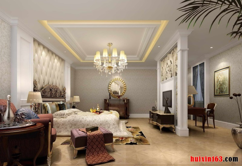 在本案例的装修当中,虽说是古典风格的装修,但也融入一些现代化的装饰元素,既有着现代简约的时尚感,也有着古典的木质韵味,双层石膏板粘贴吊顶的设计,在通过黄色光晕的衬托,营造出一种浪漫、温馨的氛围。