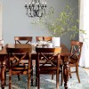 本套餐厅装饰中空间内的装饰色调主要是以白色为主,石膏板吊顶设计的比较具有个性,将中间的黑色铁艺吊灯衬托的十分精致,唯美的造型点缀了素雅的空间,使整体装饰显得十分靓丽。