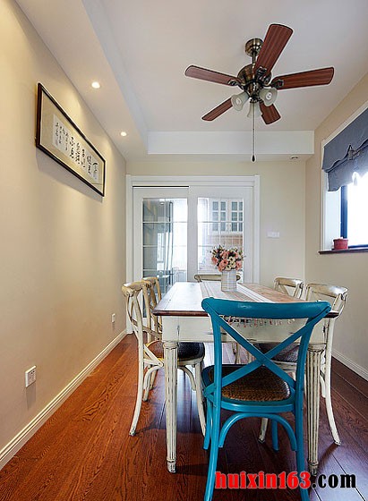 本套餐厅装饰的整体效果可以带给人们一种温馨感,空间内的石膏板吊顶设计比较柔和,将中间的铁艺吊灯衬托的更加别致,下方的白色餐桌上搭配了一款布艺桌布,使整个空间都充满了清新的色彩。