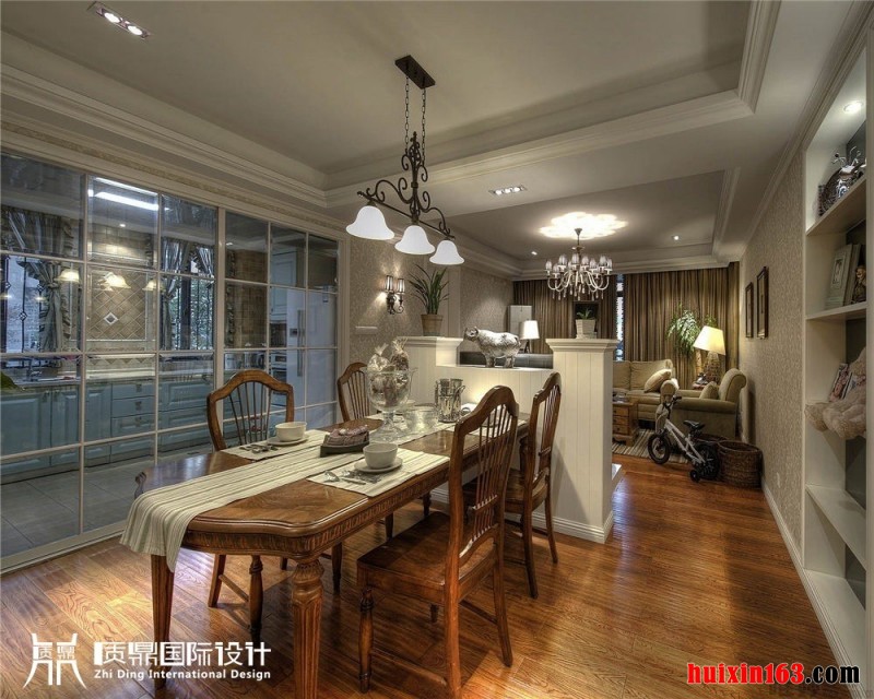 美式风格的整体装饰可以带给人们一种华丽并且带有一丝粗犷的感觉,空间内的装饰材料主要会应用一些实木材质为主要材料,并会搭配一些布艺装饰来点缀空间,在华丽的氛围下也为空间平添了一丝浪漫。 本套餐厅装饰中石膏板吊顶的设计比较大气,平顶式的设计将黑色的铁艺吊灯衬托的更加精致、唯美,下方的实木餐桌上搭配了棉麻的布艺桌旗,更是可以凸显出质感与设计主题。 更多»推荐家装效果图