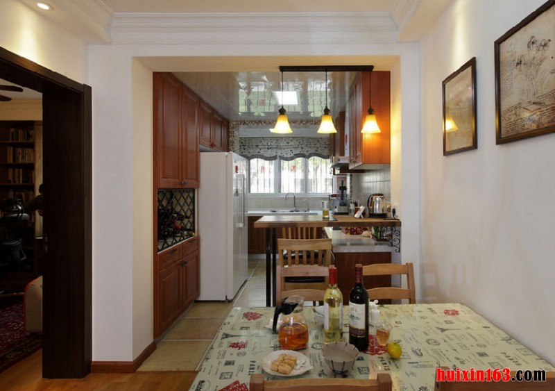 本套餐厅装饰中石膏板吊顶的设计比较大气,平顶式的设计将黑色的铁艺吊灯衬托的更加精致、唯美,下方的实木餐桌上搭配了棉麻的布艺桌旗,更是可以凸显出质感与设计主题。